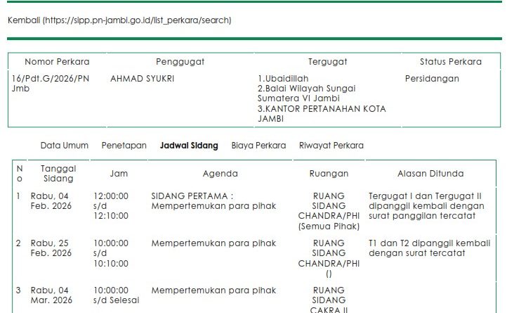 Berdasarkan data resmi Sistem Informasi Penelusuran Perkara (SIPP) Pengadilan Negeri Jambi untuk Perkara Nomor 16/Pdt.G/2026/PN Jmb, Tergugat I (Ubaidillah) dan Tergugat II (BWSS VI) secara sah TIDAK HADIR pada Sidang Pertama (4 Februari 2026) dan Sidang Kedua (25 Februari 2026). Dalam dua agenda sidang tersebut, hanya pihak BPN Kota Jambi (Tergugat III) yang taat hukum dan hadir memenuhi panggilan pengadilan.