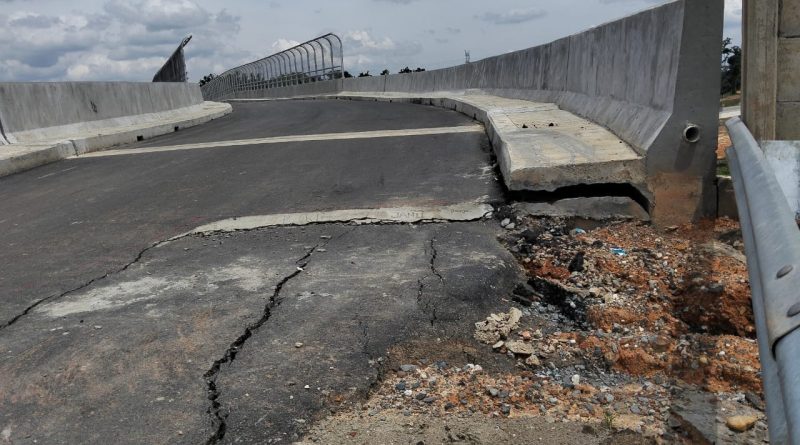 Jembatan layang (overpass) di KM.17, yang dibangun oleh PT. Hutama Karya Infrastruktur (HKI) sebagai pengganti jalan yang terputus, kini ambles 20 cm. Aspal retak menganga, dan struktur beton terlihat ‘jatuh’, menciptakan patahan berbahaya di tengah jembatan.