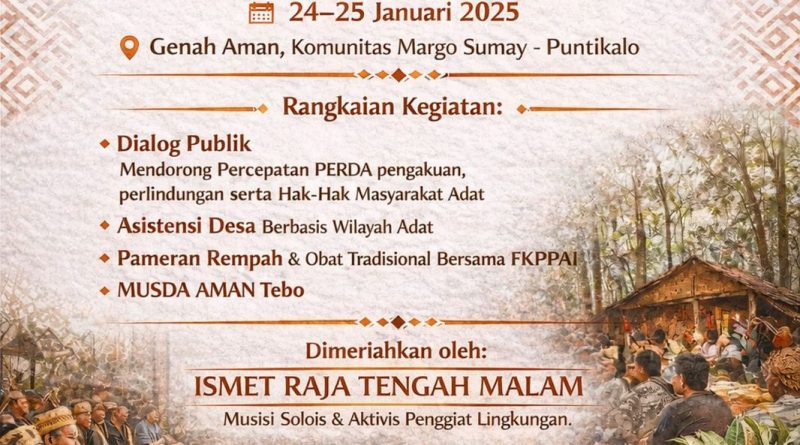 TEBO, 22 Januari 2025 – Di tanah Bumi Seentak Galah Serengkuh Dayung, sebuah perhelatan besar bukan sekadar soal rapat dan palu sidang. Musyawarah Daerah (MUSDA) ke-III Aliansi Masyarakat Adat Nusantara (AMAN) Tebo yang akan digelar pada 24-25 Januari 2025 di Genah Aman, Margo Sumay, Puntikalo, bakal menjadi saksi bersatunya dua kekuatan besar: perjuangan hak ulayat dan pelestarian tuah pengobatan leluhur.